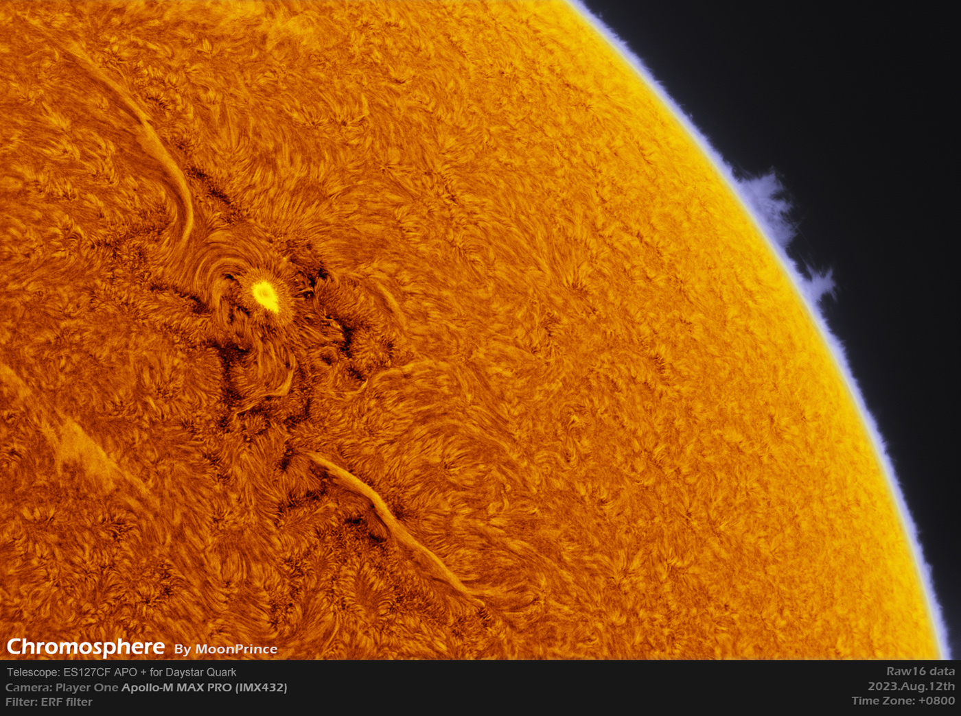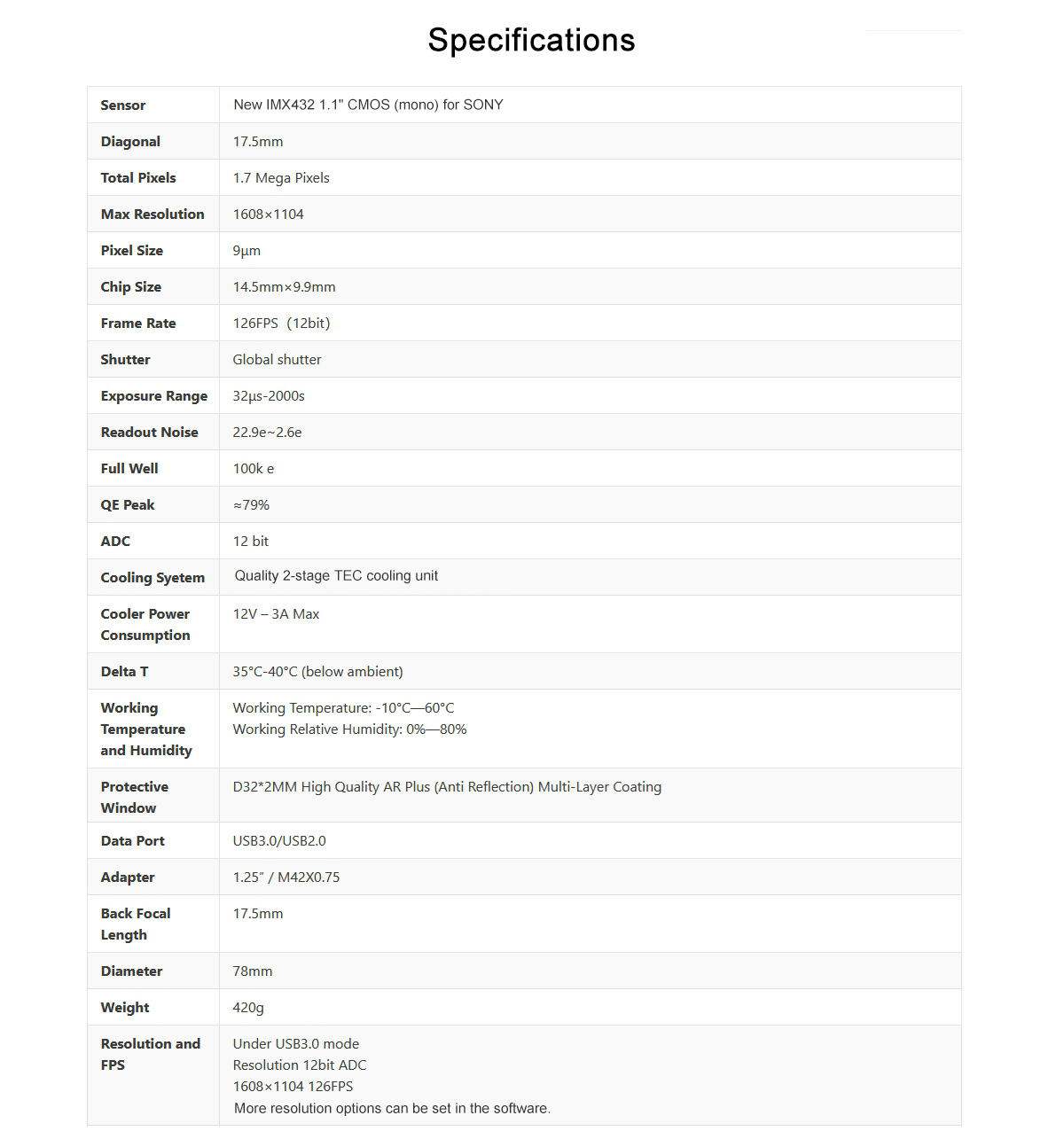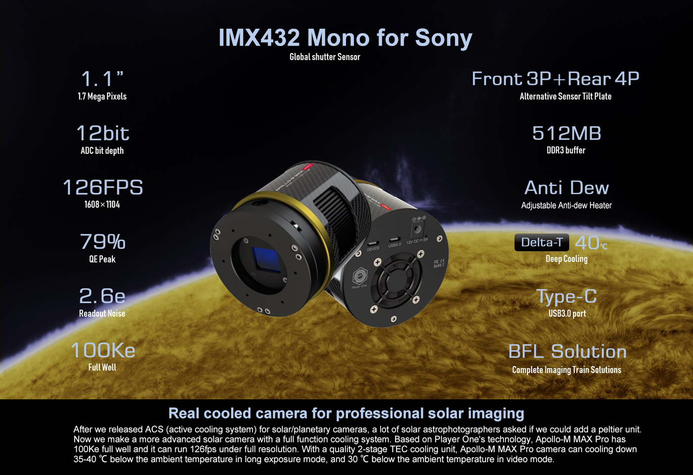 Apollo-M MAX Pro (IMX432) camera is developed by Player One Astronomy. It is a real cooled camera for solar imaging. Apollo-M MAX Pro camera adopts IMX432 1.1" format monochrome sensor for Sony. The 9um pixel size accommodates a well depth of 100Ke with a total of 1.7MP (the resolution is 1608*1104), and the diagonal is 17.5mm.