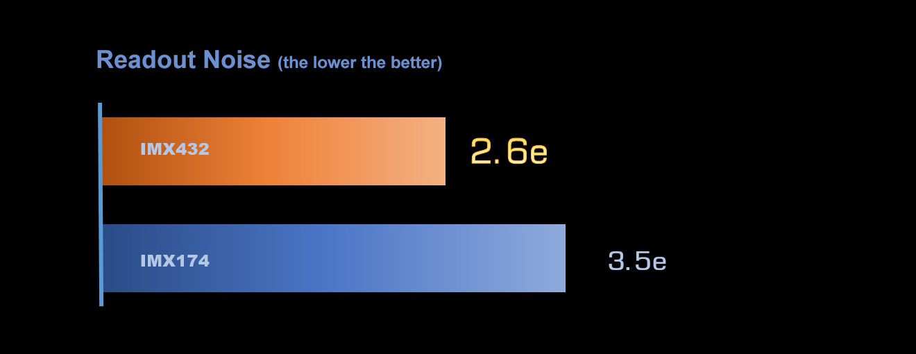At 380 gain, the Apollo-M MAX PRO (IMX432) camera has a readout noise of 2.6e. The readout noise is lower than that of the IMX174. And the full well will still be bigger than that of the IMX174.