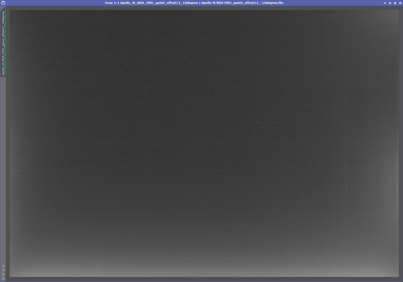 300s at gain=0, offset=10, -10 degrees, Apollo-M MAX Pro camera dark frame: Download https://player-one-astronomy.com/download/Dark%20Frames/Apollo-M%20MAX%20PRO_gain0_offset12_-10degree.zip
