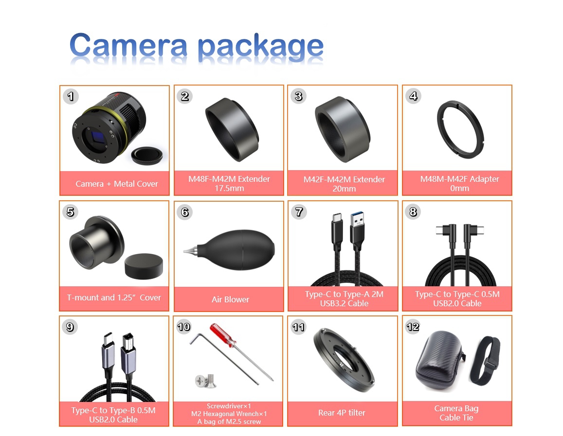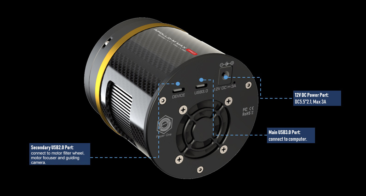 The Apollo-M MAX Pro cooled camera uses same design as Ares cooled series, but there is a little difference! With a round body and a golden and black color scheme, it uses a carbon fiber shell to keep weight down and cutting-edge outlook. We also add a sensor tilter plate and an anti-dew PCB board. The designs of this series make the camera not only light and cool, but also functional!