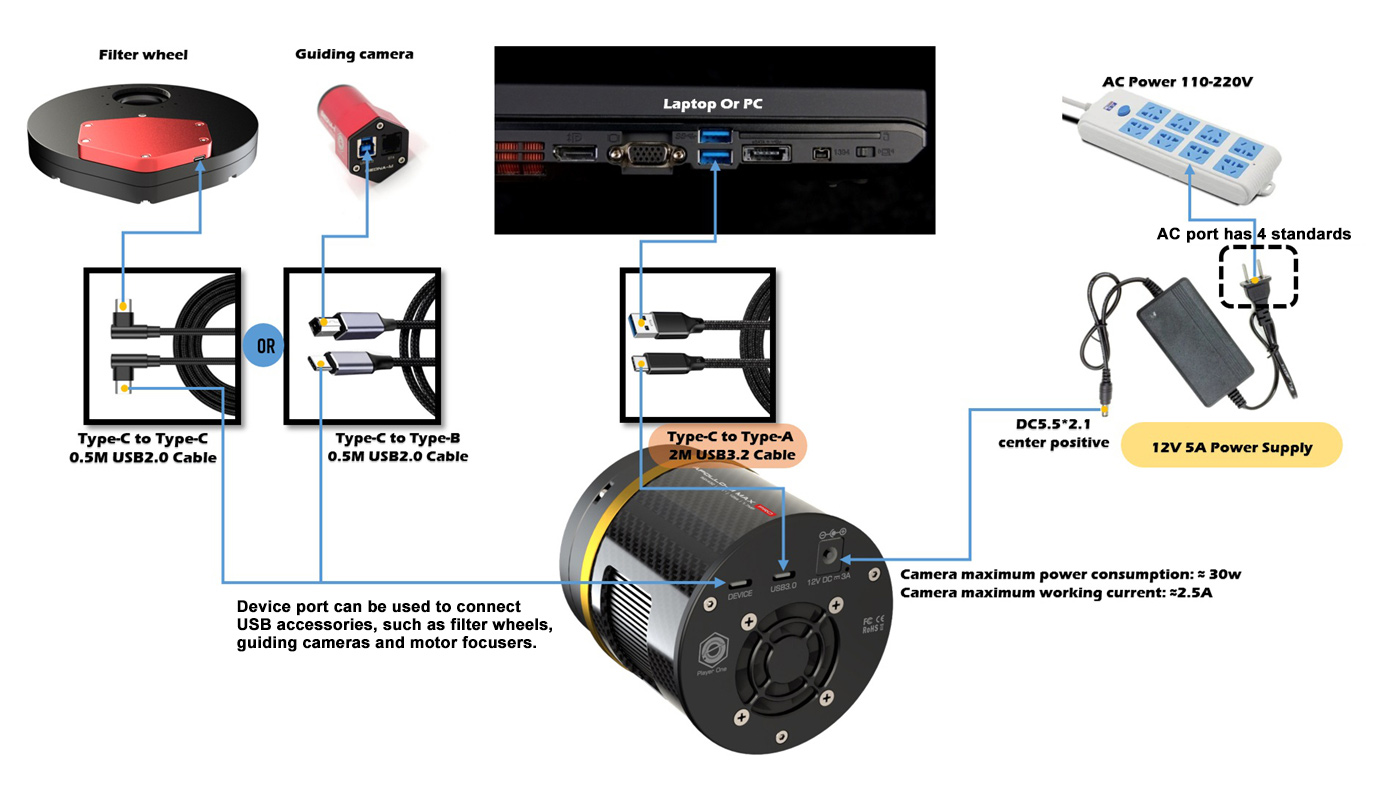 The camera has a 12V DC5.5*2.1mm interface which provides enough power for the TEC cooling system. If you don't need to turn on cooling, you only need to connect the main type-c port to use the camera as an uncooled camera.