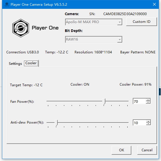 In ASCOM window, we provide 3 adjustable parameters: target temperature, fan speed and anti-dew power.