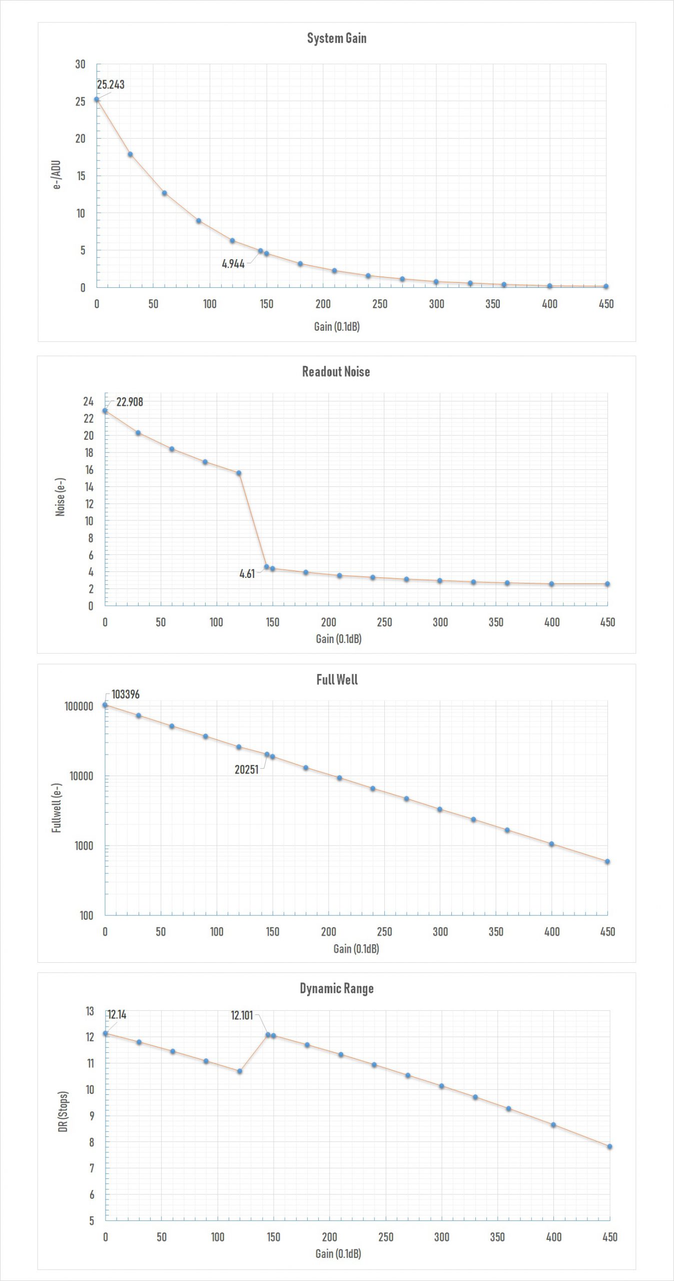 When the gain is greater than or equal to 145, the HCG mode will be automatically turned on and the readout noise will be reduced to 4.6e. The dynamic range will be increased to 12 stops again.