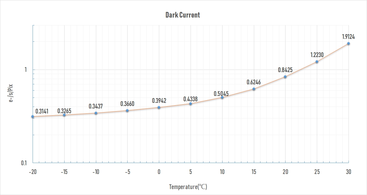 The dark current is 0.3e/s/pix at -20℃, and 0.39e/s/pix at 0℃.