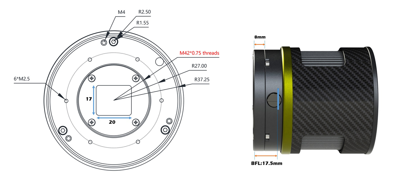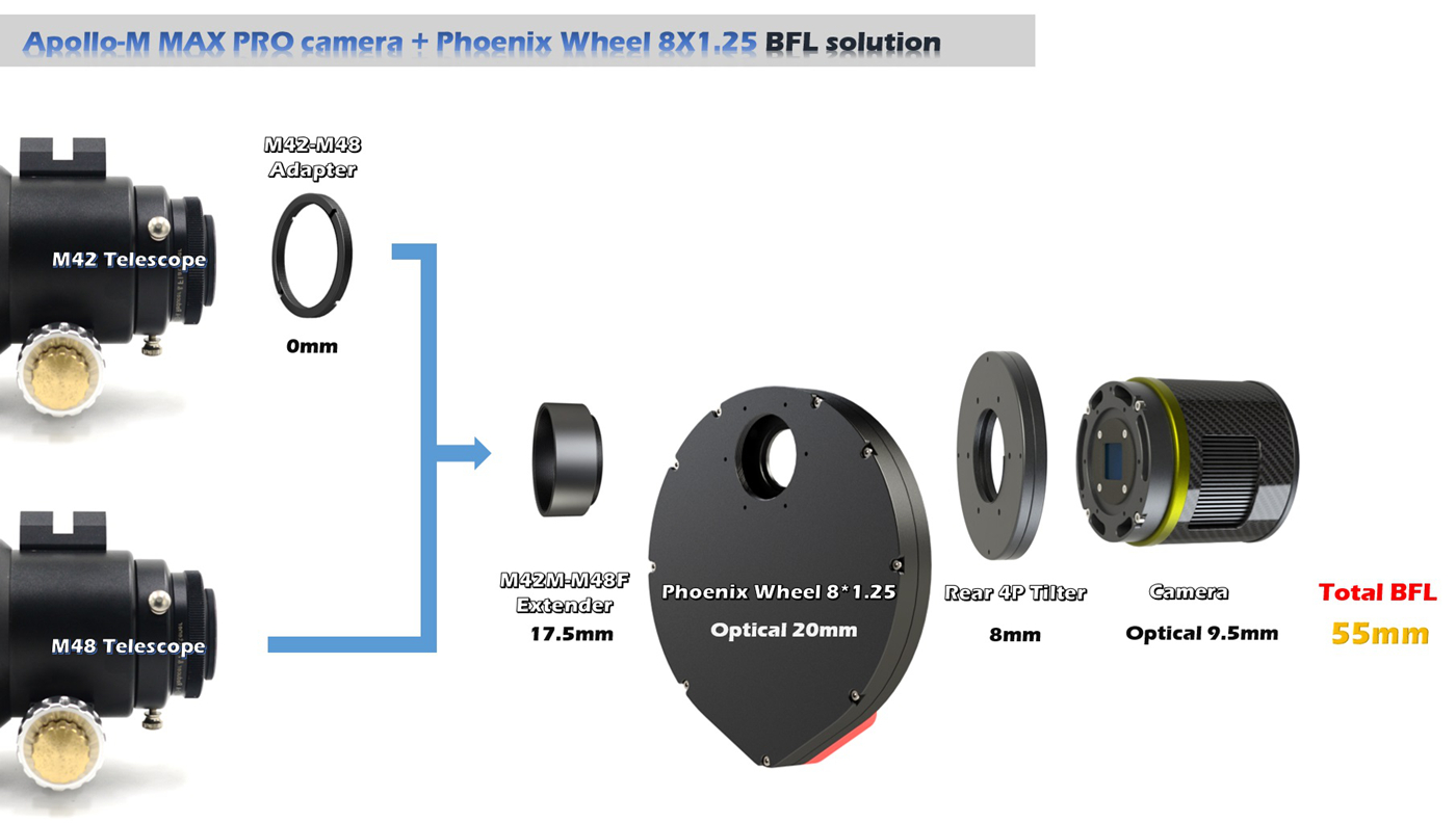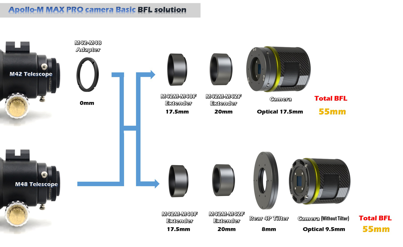 There are some recommend 55mm BFL solutions for this camera. If you don't need to think about BFL for your telescope, there will be more connection ways.