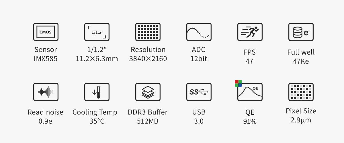 ASI585MC Pro is a new ZWO deep sky camera based on the 4K CMOS sensor (for SONY) with a 1/1.2" format and 2.9μm pixels. It has a super high sensitivity and a large resolution of 3840*2160 (8.29MP in total). It also features high transmission speeds – In high-speed mode, the fast frame rate can reach 47fps at full resolution! Being an entry-level DSO camera, it offers great advantages of high cost-effectiveness.