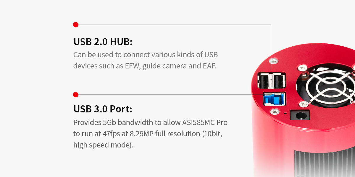 - USB 3.0 Port: Provides 5Gb bandwidth to allow ASI585MC Pro to run at 47fps at 8.29MP full resolution (10bit, high-speed mode).