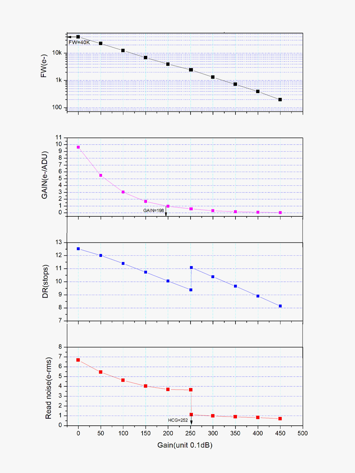 - When the gain reaches 252, the HCG mode will be automatically turned on and the dynamic range reaches a level close to 11bit. The read noise in this case can be as low as 0.9e.