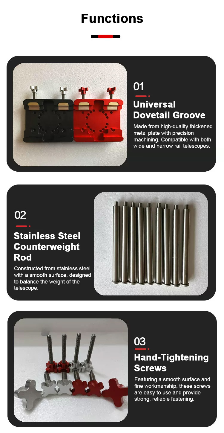 - Universal Dovetail Groove: Made from high-quality thickened metal plate with precision machining. Compatible with both wide and narrow rail telescopes.