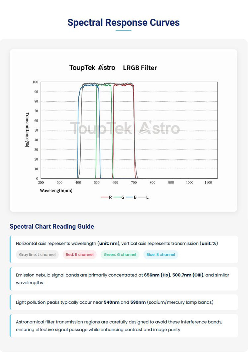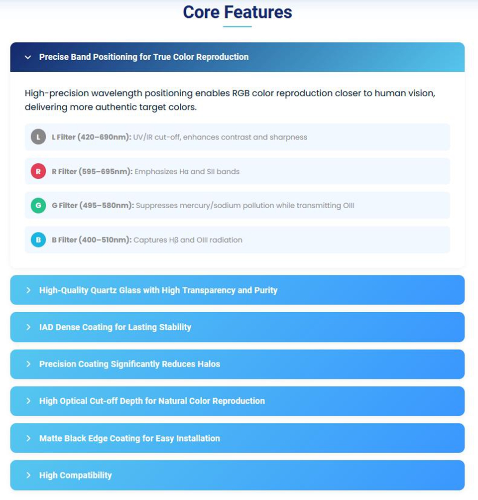 - LRGB filters utilize advanced optical materials and precision coating technology to selectively transmit celestial radiation while blocking urban light pollution. This not only vividly reveals the authentic colors of the night sky but also significantly enhances image contrast.