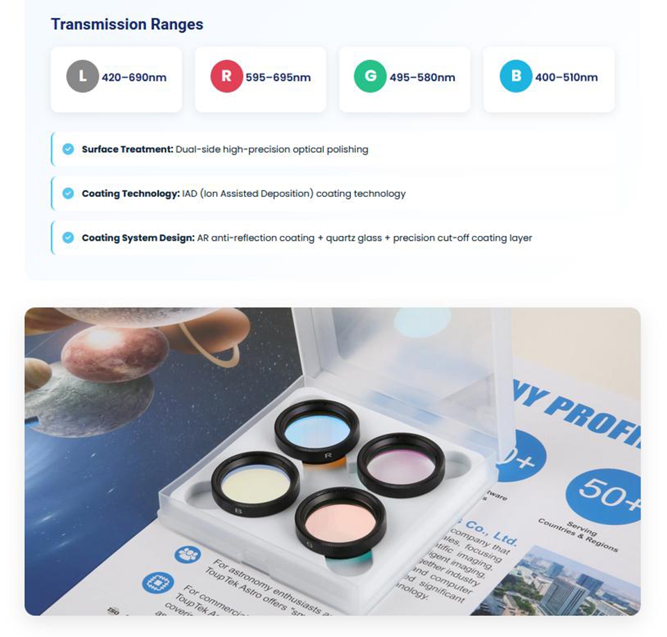 - LRGB filters utilize advanced optical materials and precision coating technology to selectively transmit celestial radiation while blocking urban light pollution. This not only vividly reveals the authentic colors of the night sky but also significantly enhances image contrast.