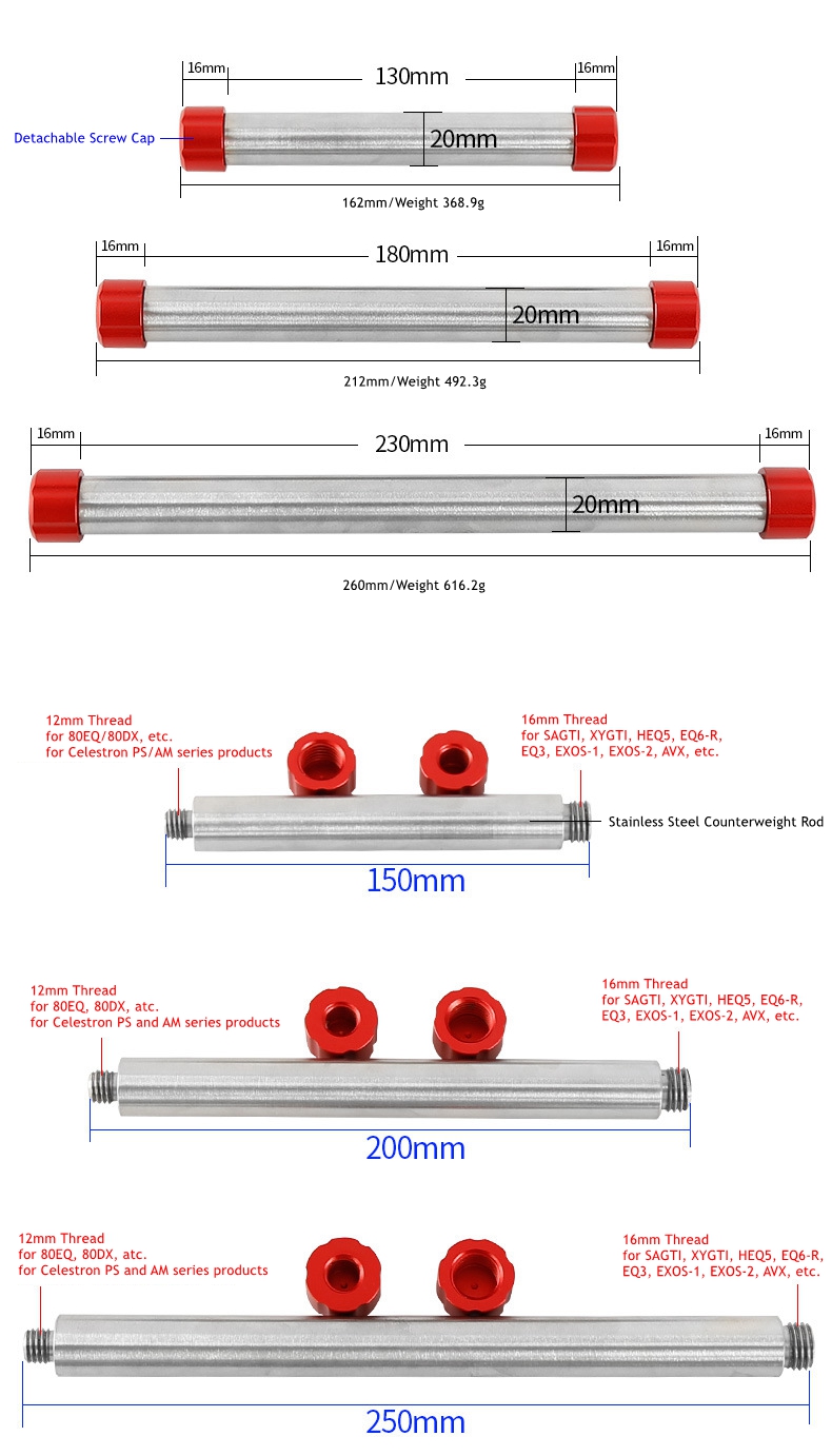 150mm 200mm 250mm Long Stainless Steel Counterweight Balance Bar Rod High Quality Accessory for EQ3 Equatorial Mount